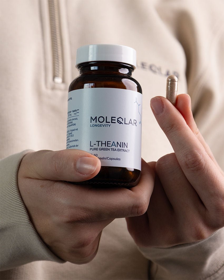 Reines L-Theanin aus grünem Tee – natürlich, vegan und in geprüfter MoleQlar Qualität.