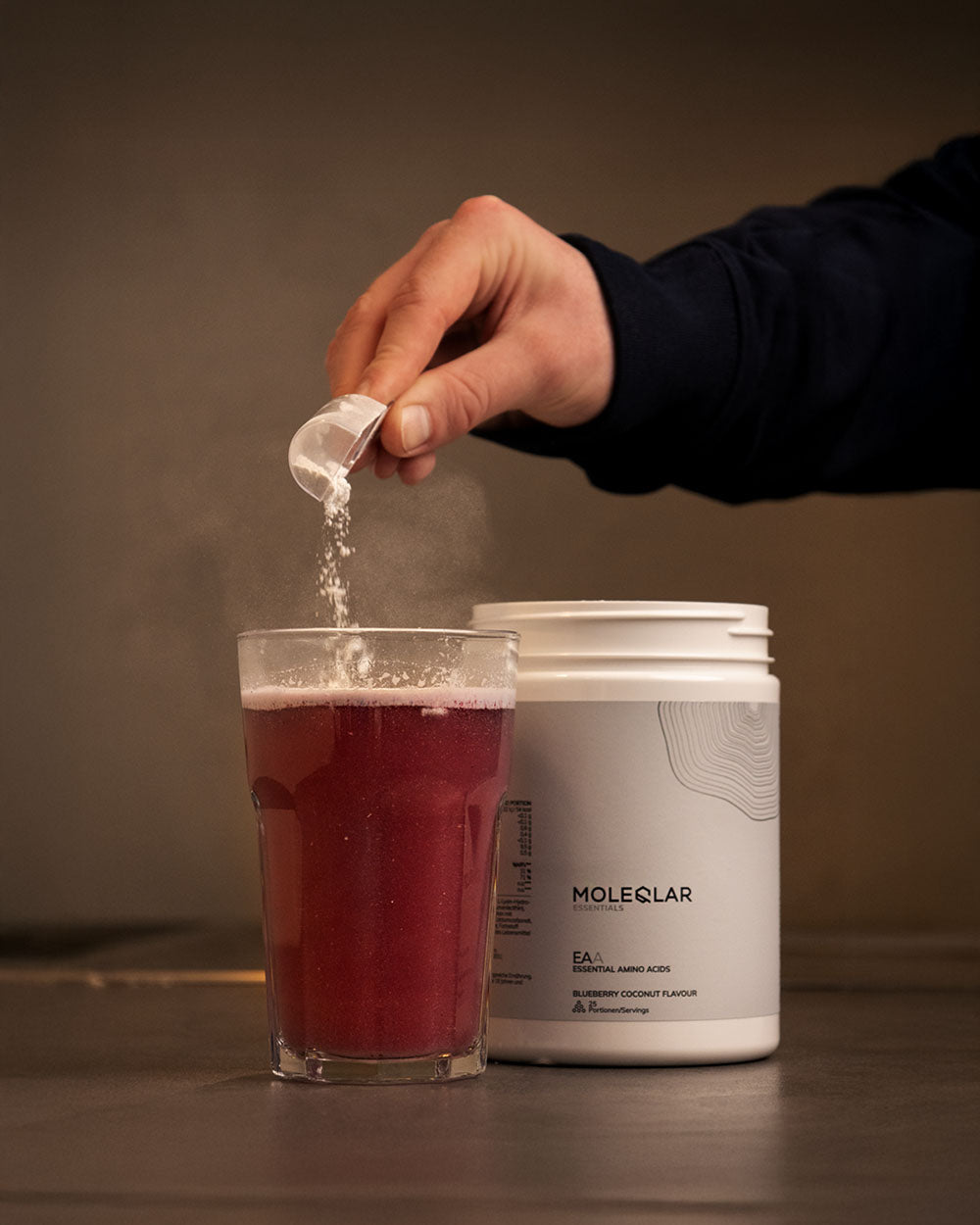 - Gut lösliches EAA Pulver im abgestimmten Verhältnis mit erfrischendem Blaubeer-Kokosnuss-Geschmack